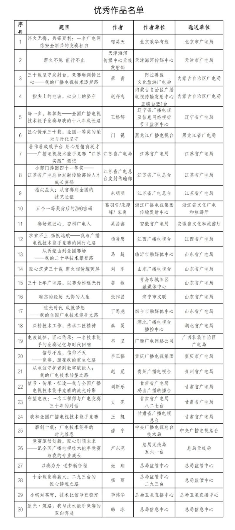 活动得到各单位和广大干部职工的积极响应并踊跃投稿,至截稿日,共收到符合要求的征文267篇。征文从多个维度、全面讲述了全国广播电视技术能手竞赛举办30年来,基层一线技术人员比拼技能、锐意进取、顽强拼搏的感人故事,用质朴的文字表达了对党的绝对忠诚和对广电事业的无限热爱,以竞赛的“小切口”反映30年来广电事业发展的“大时代”。经过严格的筛选、评审,最终遴选出优秀作品30篇。现将优秀作品名单公布(排名不分先后)。