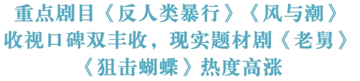 纪念抗日战争胜利80周年重点剧目《反人类暴行》(江苏卫视)于12月13日“国家公祭日”开播,上线至今豆瓣评分8.7分,为2025年度评分最高国产剧集。12月首播前17集,全国收视3424.7万人次,位列优酷独播剧热度榜榜首。《风与潮》(CCTV1)于12月9日开播,12月首播前23集,每集平均收视率2.985%,各集收视稳居同时段所有节目第一。