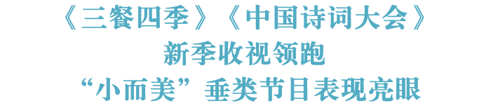 文化类节目《三餐四季(第三季)》《中国诗词大会(第十季)》(CCTV1)开播收视亮眼,首期节目收视率分别为3.000%、2.740%,均为往季最高,并包揽12月季播文艺收视率前二。