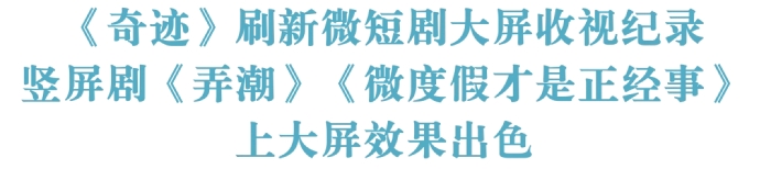 微短剧《奇迹》(CCTV1)讲述深圳经济特区发展故事,自12月22日在CCTV1黄金档播出后,刷新了微短剧在卫视频道播出以来的收视记录。开播三日累计收视人次即突破1亿,12月首播12集,累计收视超2.0亿人次,平均收视率达2.917%,收视份额稳定在10%以上。同时,该剧在深圳当地收视率3.963%、收视份额21.595%,反映故事背景地观众的高度关注。