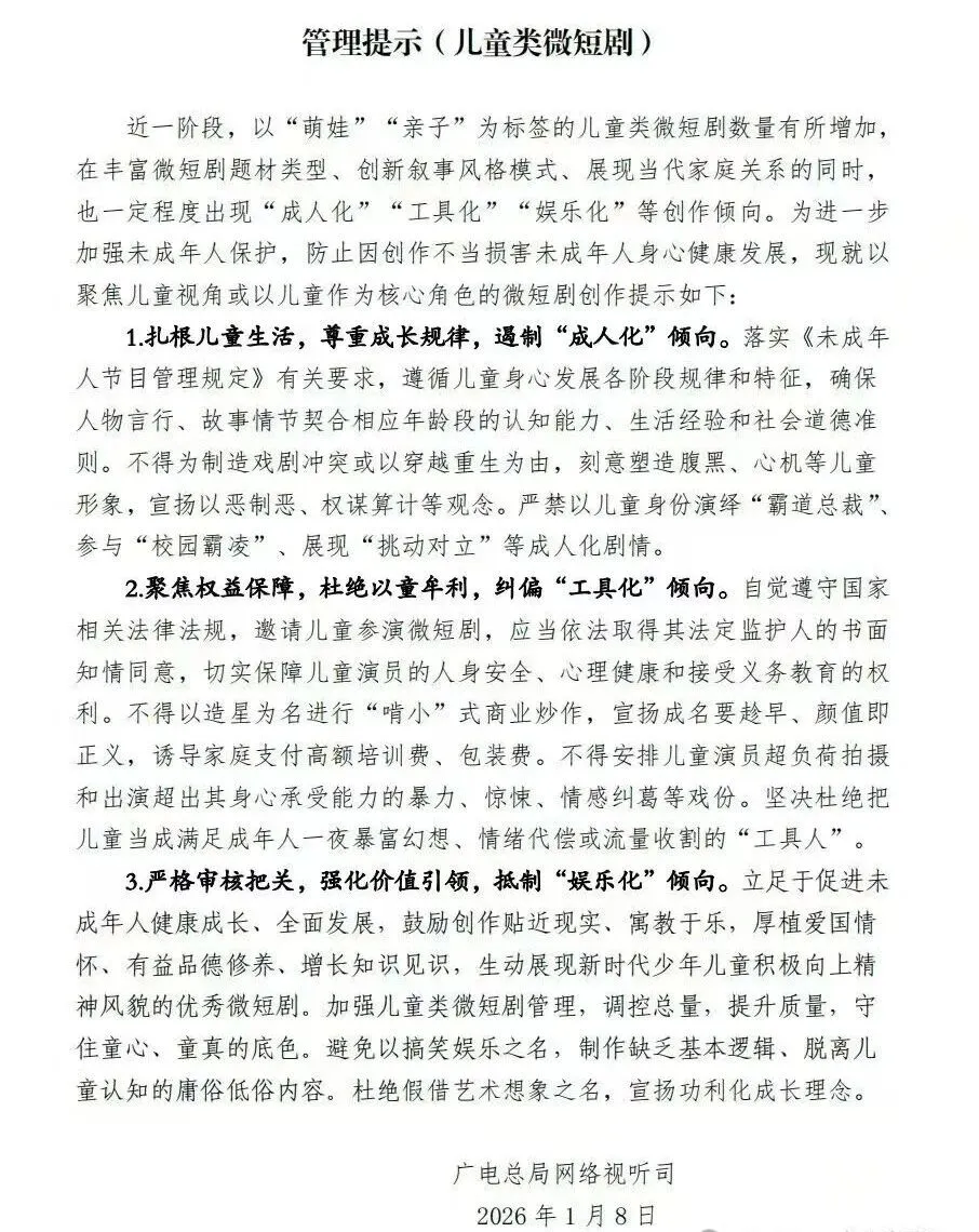1月8日,广电总局网络视听司发布儿童类微短剧管理提示,要求遏制“成人化”倾向,纠偏“工具化”倾向,抵制“娱乐化”倾向。
