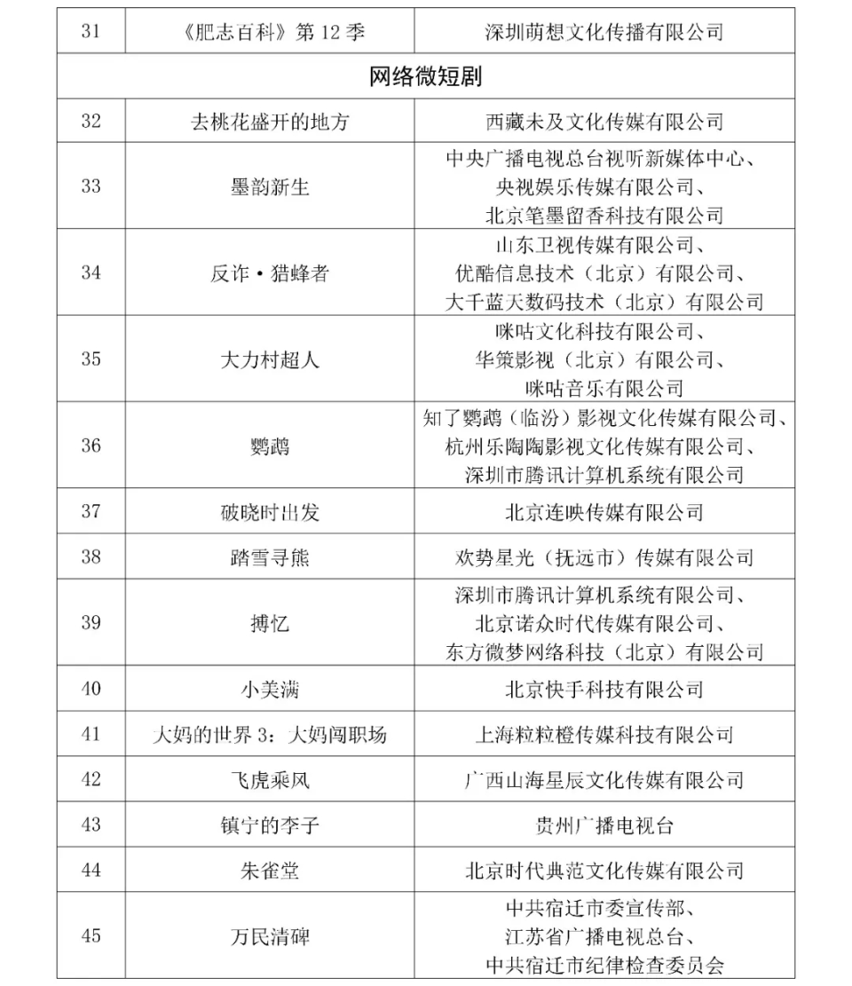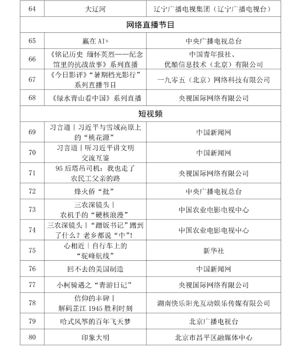 为深入学习贯彻习近平文化思想,深入实施广播电视和网络视听精品创作工程,国家广播电视总局近期组织开展了2025年第三季度优秀网络视听作品推选活动。活动以繁荣互联网条件下的新大众文艺为导向,鼓励网络视听行业创作生产高质量视听内容,发挥优秀作品示范引领作用,营造良好创作传播生态。经省级广电行政部门和中央直属单位等推荐,专家评审委员会评审等程序,最终研究确定100部作品入选,现将结果予以公布。