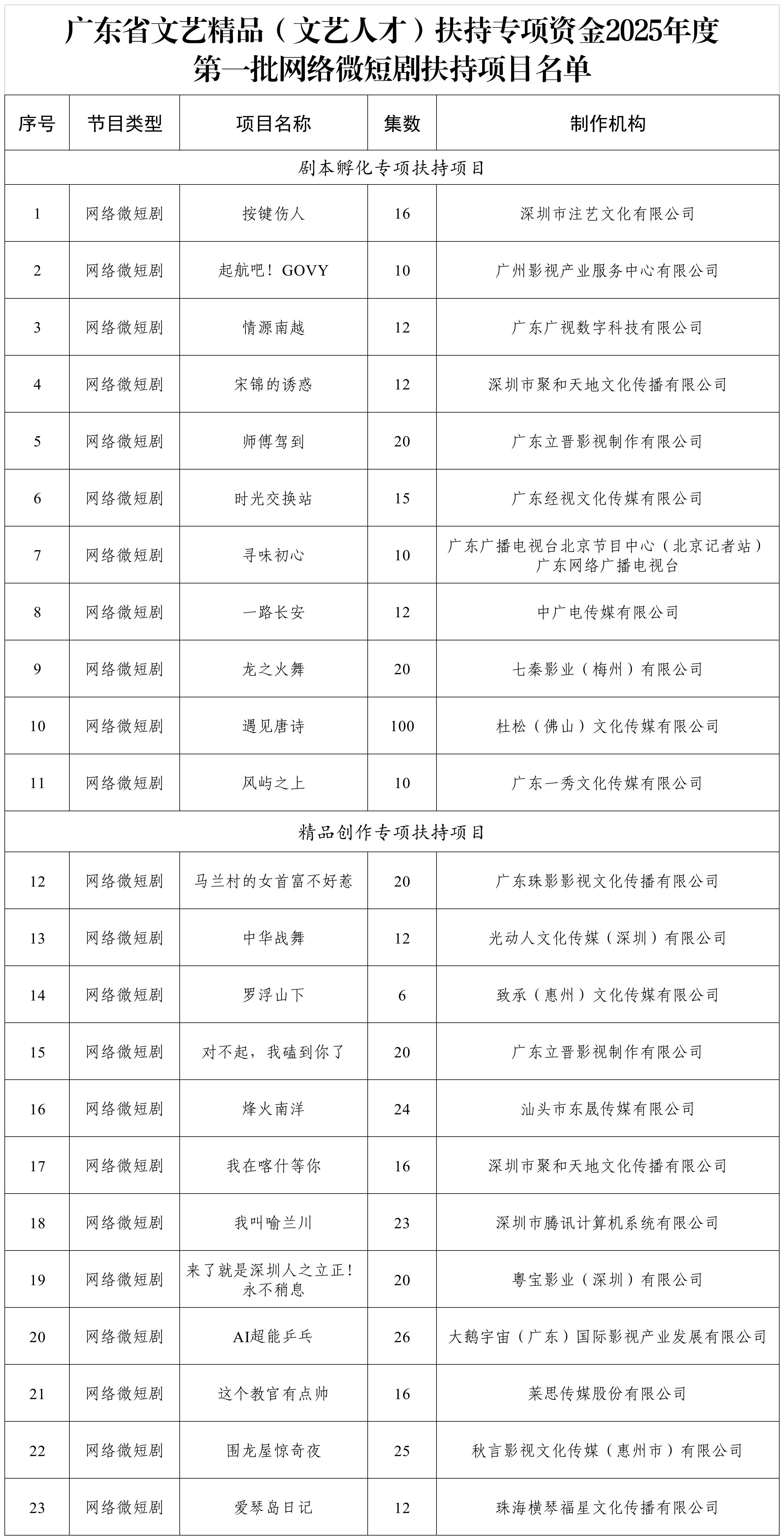 根据《关于申报2025年度广东省文艺精品(文艺人才)扶持专项资金电视剧及网络剧片剧本孵化、精品创作、播出激励项目的通知》(粤广电剧〔2025〕1号),经专项评审程序,拟对2025年度第一批23个网络微短剧项目给予扶持,现予以公示。公示时间从2025年6月16日至22日止。若对扶持项目有异议,请实名电话并书面向省局网络视听节目管理处反映。